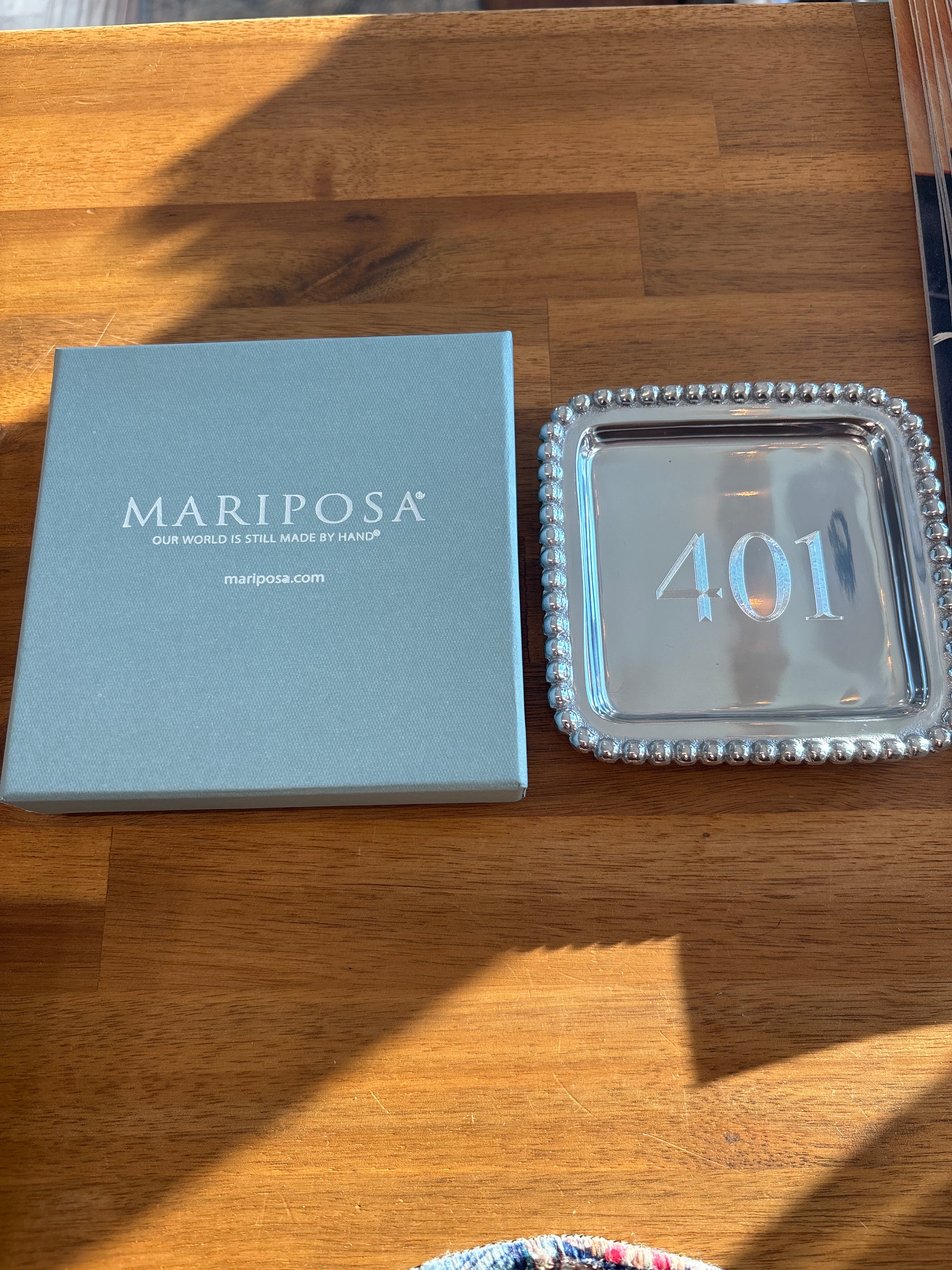 Represent Rhode Island with this 401 elegant Beaded Square Tray. Perfectly sized to hold rings on a dresser or post-it notes on a desktop. Handcrafted from 100% recycled aluminum with a beaded edge and engraved with 401