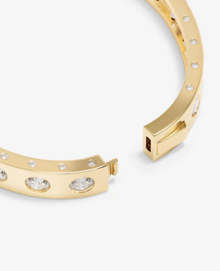 Lock in. Designed with lock-inspired detailing, bezel-set round simulated diamonds, and a thick 9mm silhouette, finished with a seamless hinge that closes with ease. Ashley just clicks.
