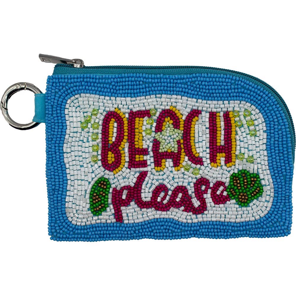 Beach Please beaded keyring coin pouch. – Bright blue with beach-inspired beadwork. Features a zipper closure and a convenient keyring. Handmade with durable materials, perfect for organizing small essentials on the go.