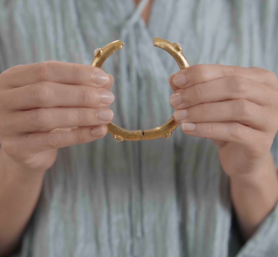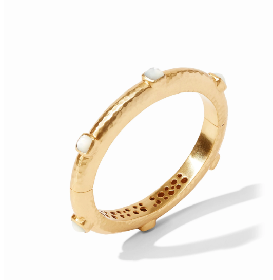 Lightly hammered bangle showcasing six stations of rose-cut imported glass with mother of pearl doublet.
