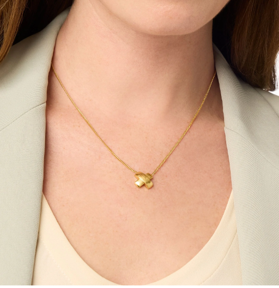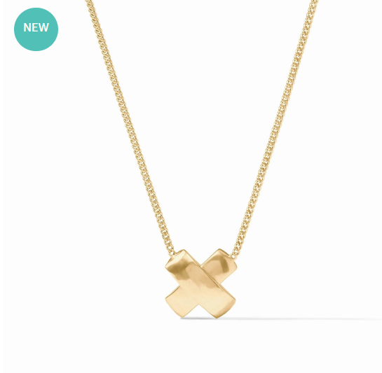 Contrasting textures unite in this X-shaped necklace where one golden bar with a lightly hammered finish overlaps another with a smooth, satiny surface, the pair linked by a delicate adjustable curb chain.