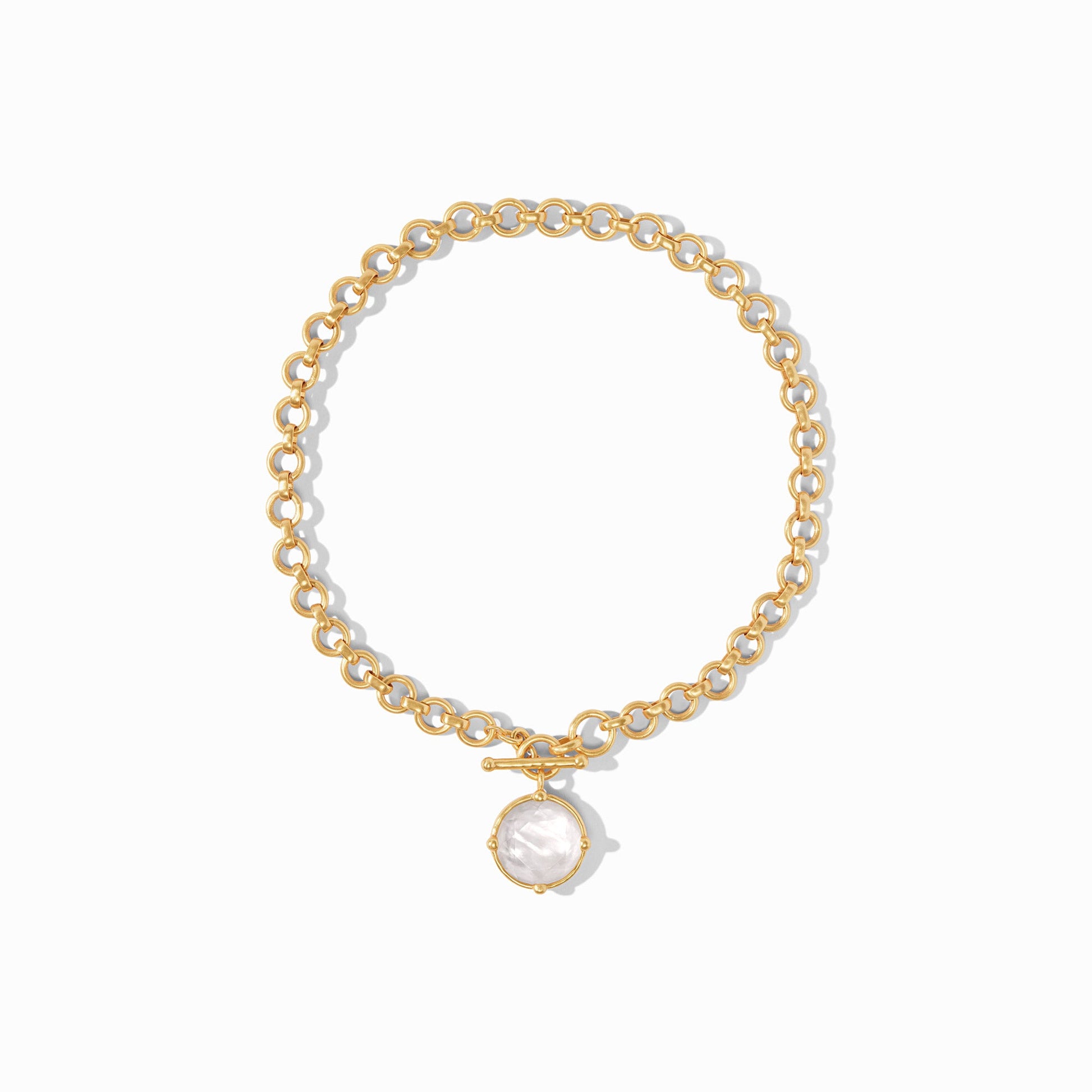 This demi-sized version of a favorite necklace has two ways to wear: Show the rose cut stone accented with golden beads or flip it to display a detailed bas relief bee.