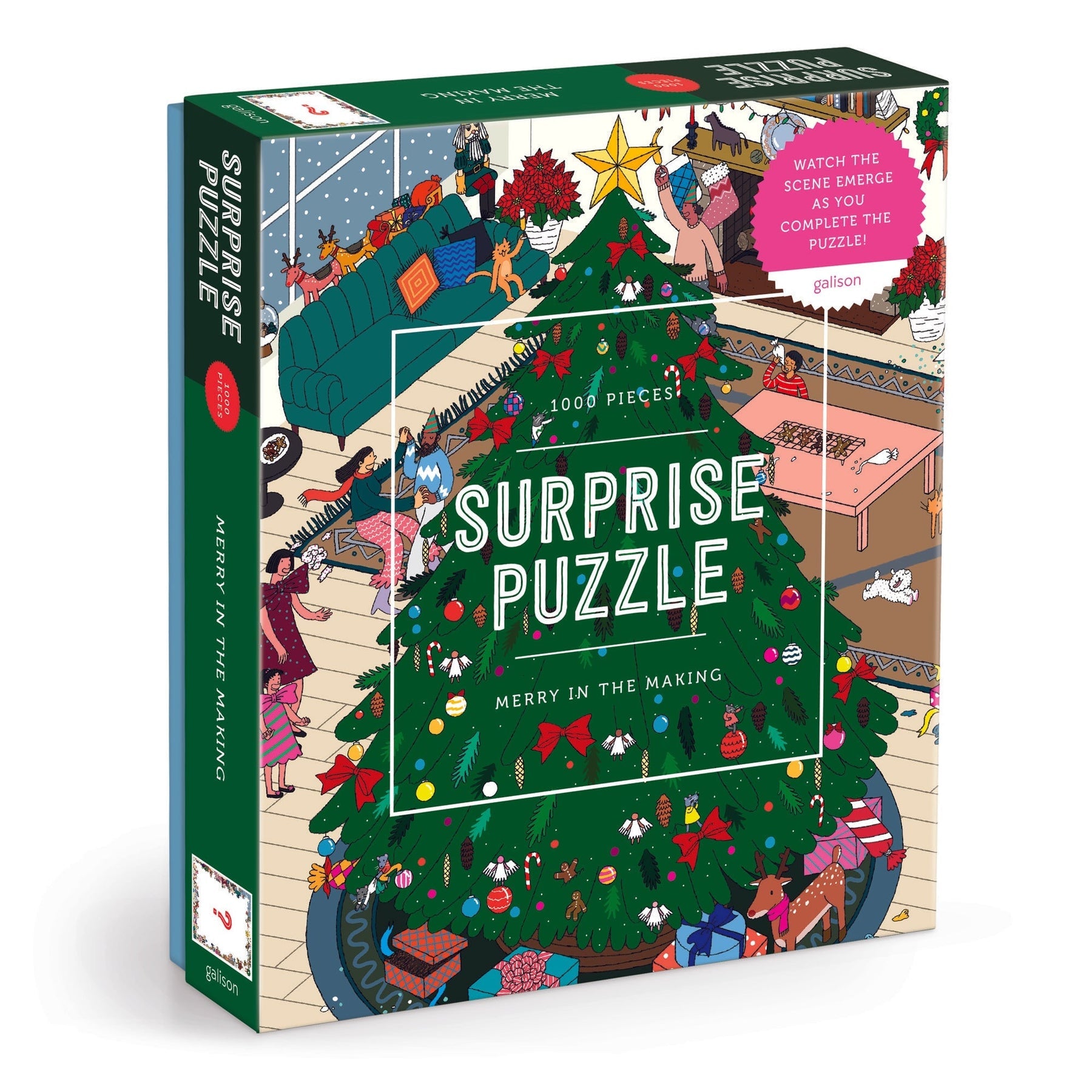 The Merry In The Making 1000 Piece Surprise Puzzle from Galison is the perfect amount of exciting and challenging for hours of puzzling fun. The box includes an insert with the puzzle image except for the center portion which is designed to be a surprise and completed with no visual reference.