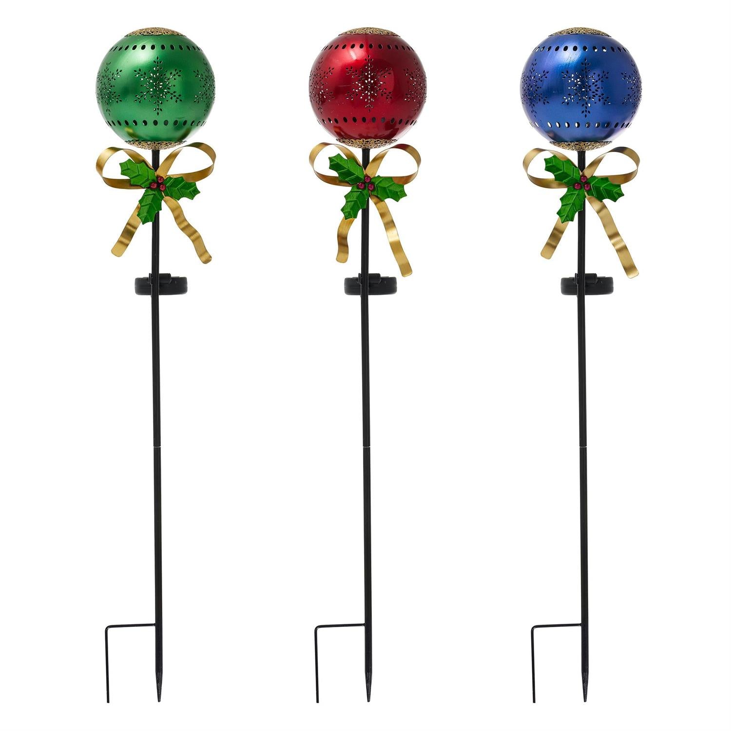 Add a charming touch to gardens, yards, or pathways with this Christmas solar garden stake. These stakes feature three designs of colorful ornaments in red, blue, and green. They have cutout snowflake designs and bows accented with holly and berry for a fun festive finish. They emit a soft glow making them the perfect addition to any outdoor space for an extra dose of colour. Crafted of outdoor safe and weather-resistant materials, this stake assortment is ideal for sprucing up any garden. Allow the solar panel to receive up to six hours of direct sunlight for best results. The sturdy h-stake allows for easy display in damp soil.
