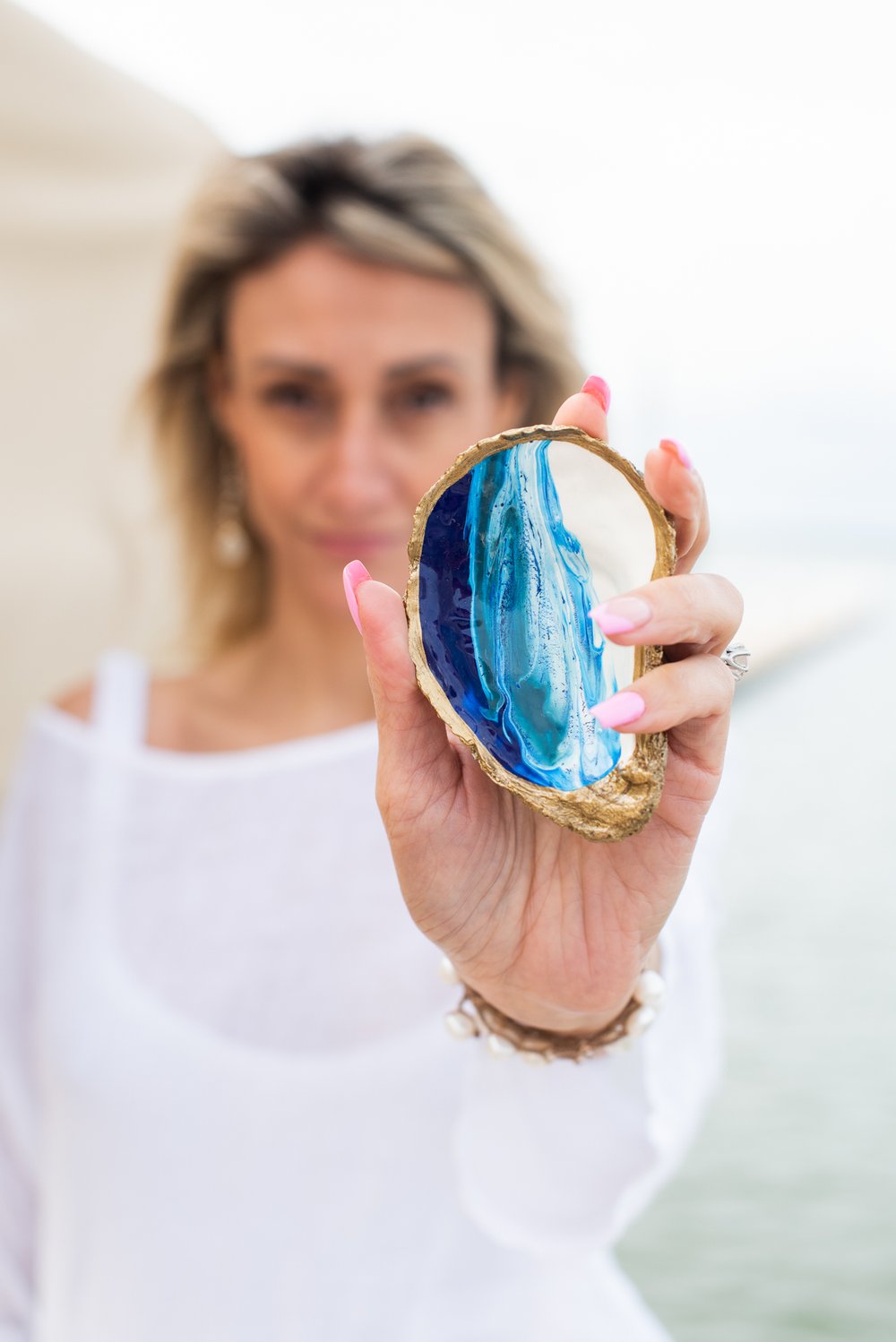 As a green company, the display of the gold oyster jewelry dish reminds you that with 1 shell gifted at grit & grace, we recycle 10 back to the water.