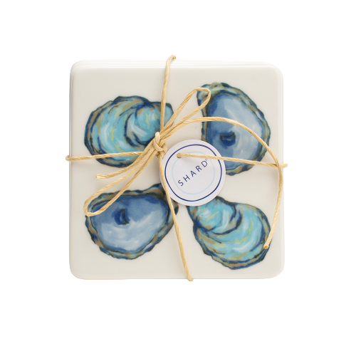 This exquisite coaster set features a mesmerizing display of oysters in shades of blues, greens, and greys,