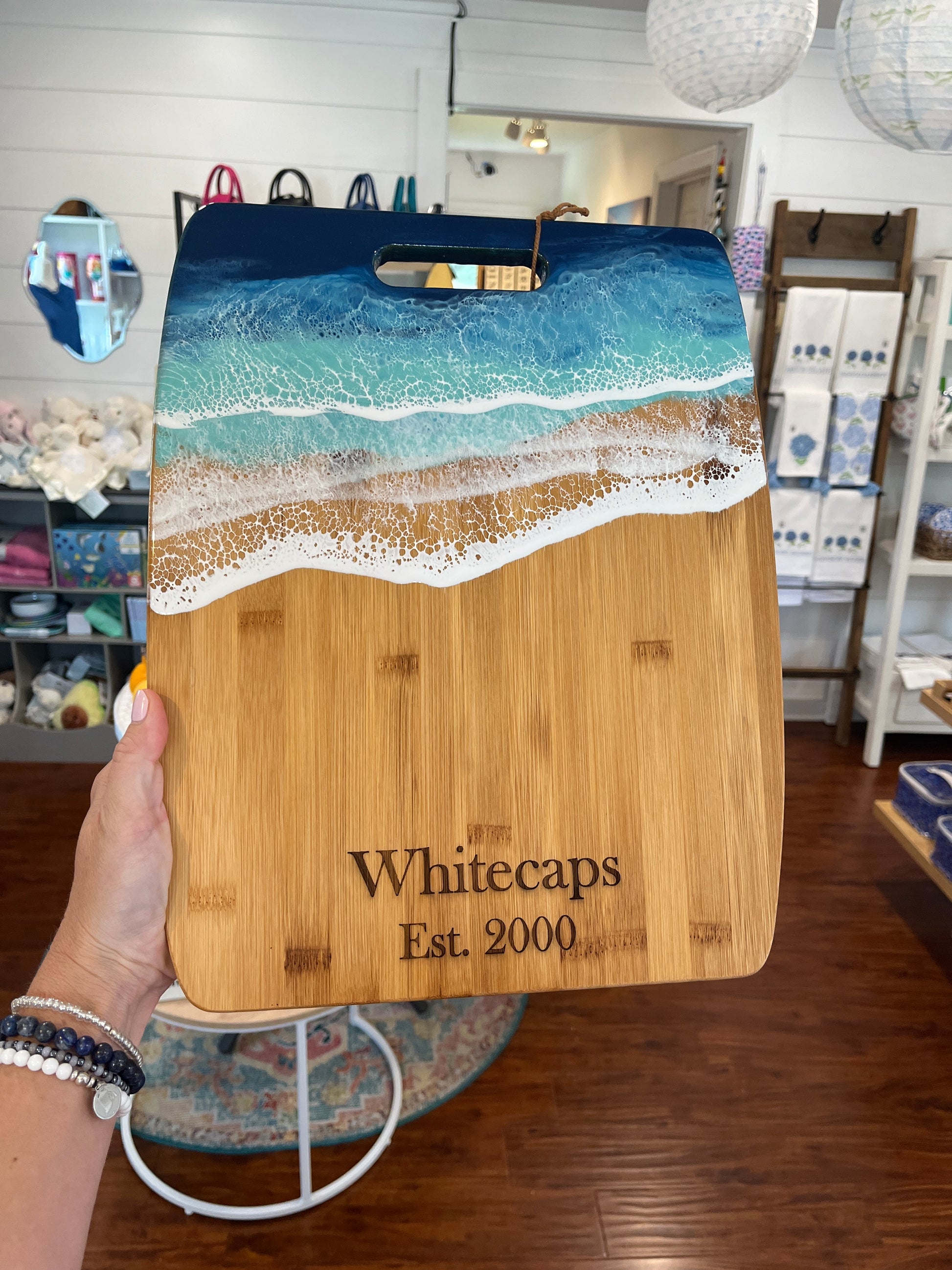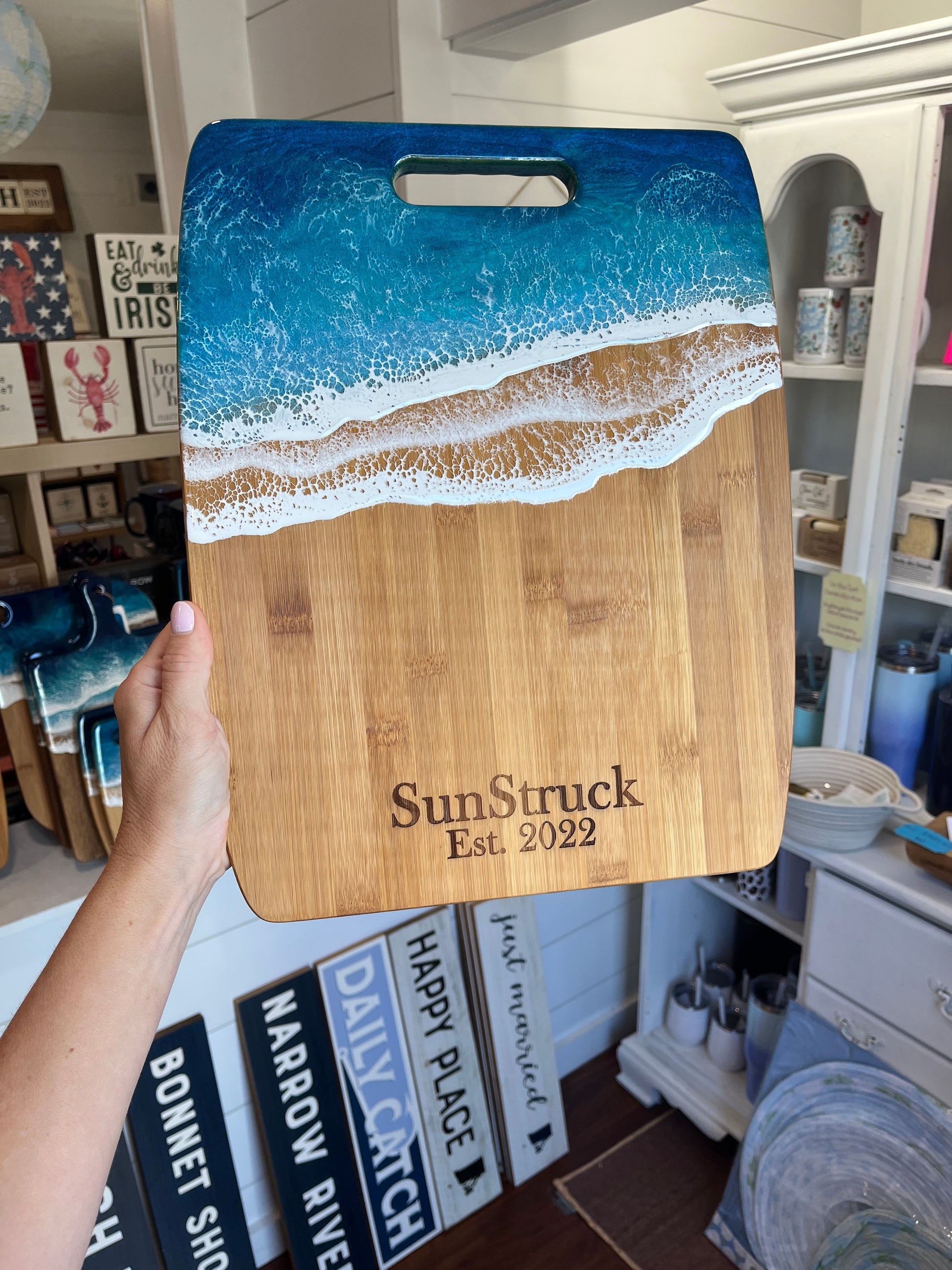 Rhode Island made serving board with ocean waves (food safe resin). Laser engraved with personalization for a wonderful gift!
