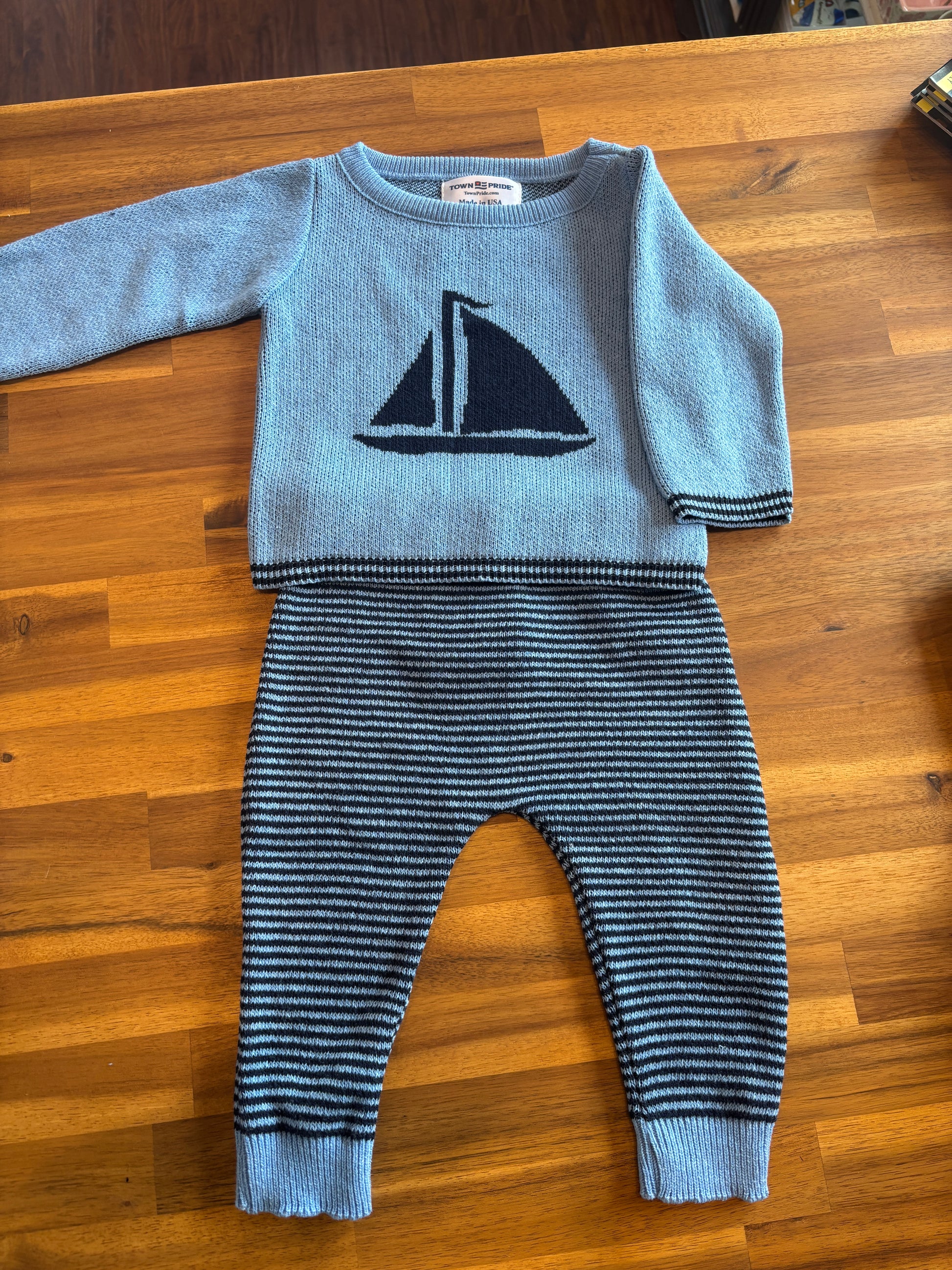 Sailboat Sweater & Striped Pants Set – Navy & Light Blue