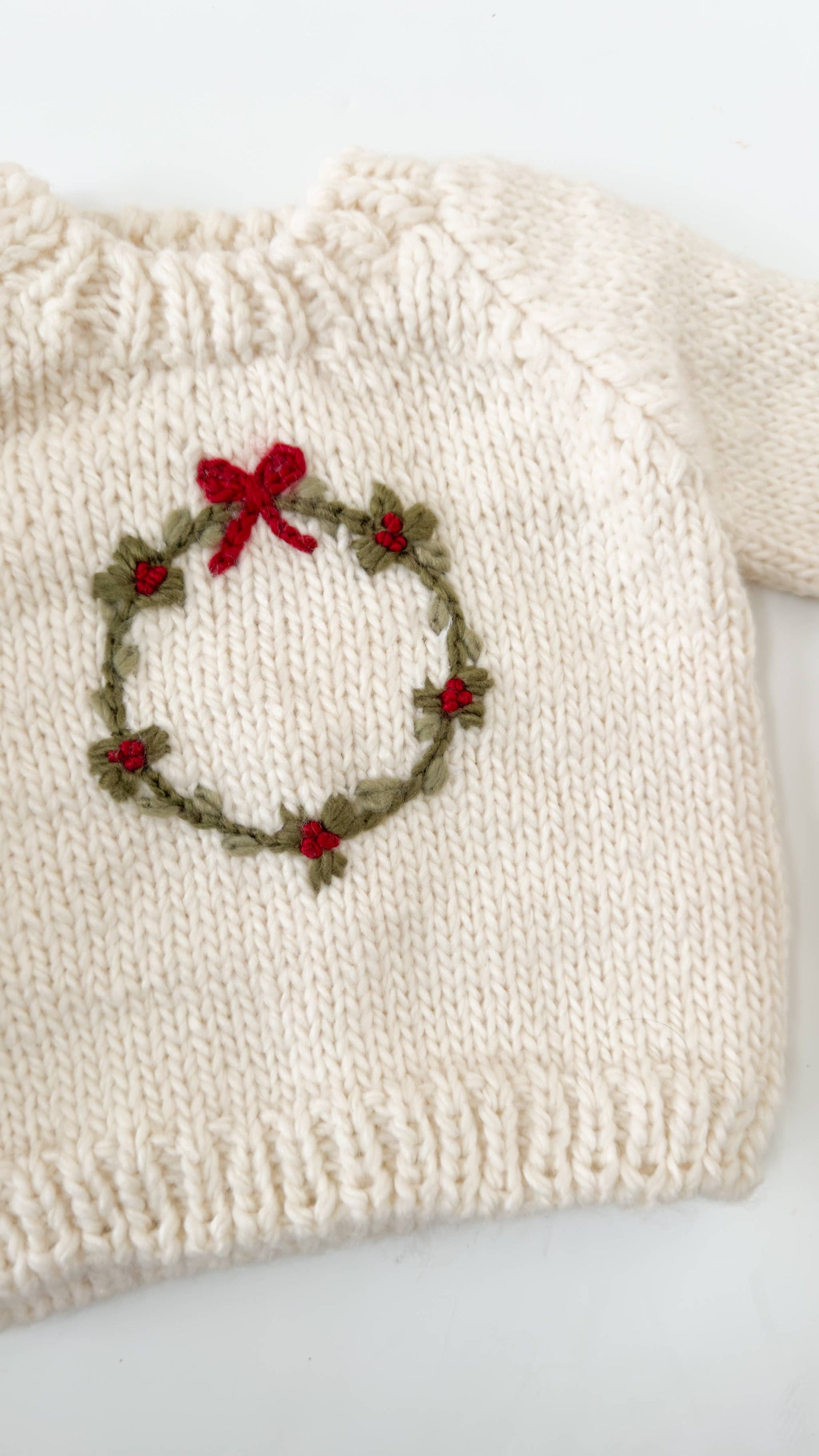 Deck the halls with our festive Wreath sweater. This Cream sweater features a hand-embroidered Moss wreath with Red berries and a simple bow. Pair with our Present hat!